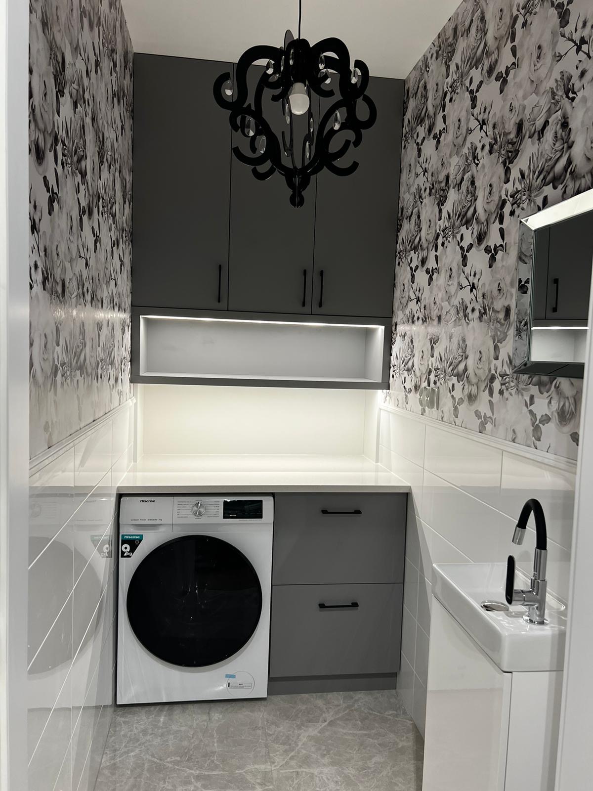 Pralka, telewizor, pralnia oraz duża szafa w przedpokoju